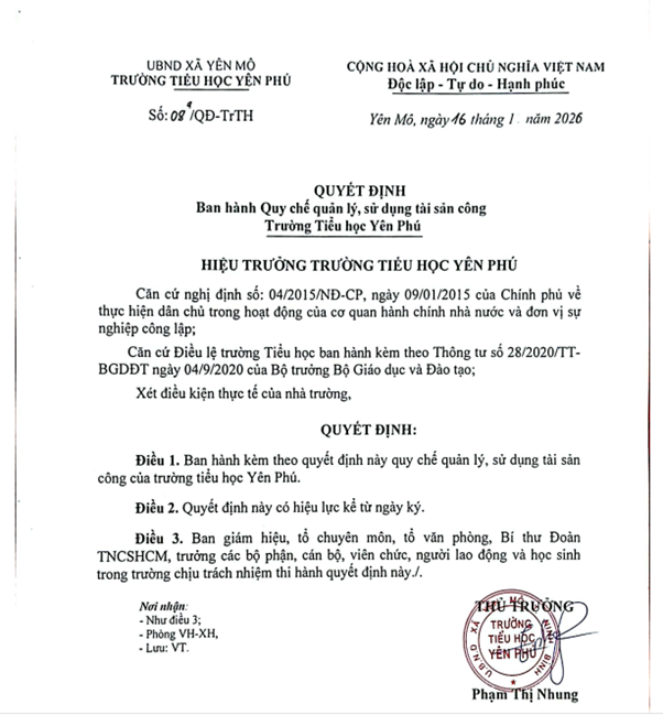 Quyết định ban hành quy chế quản lý, sử dụng tài sản công trường Tiểu học Yên Phú