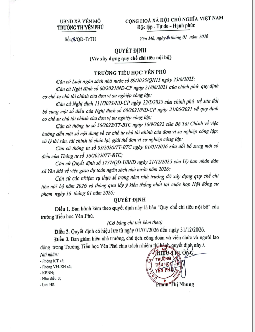 Quyết định về việc công khai số liệu, thuyết minh tình hình thực hiện dự toán ngân sách nhà nước Quý IV năm 2025 của Trường Tiểu học Yên Phú